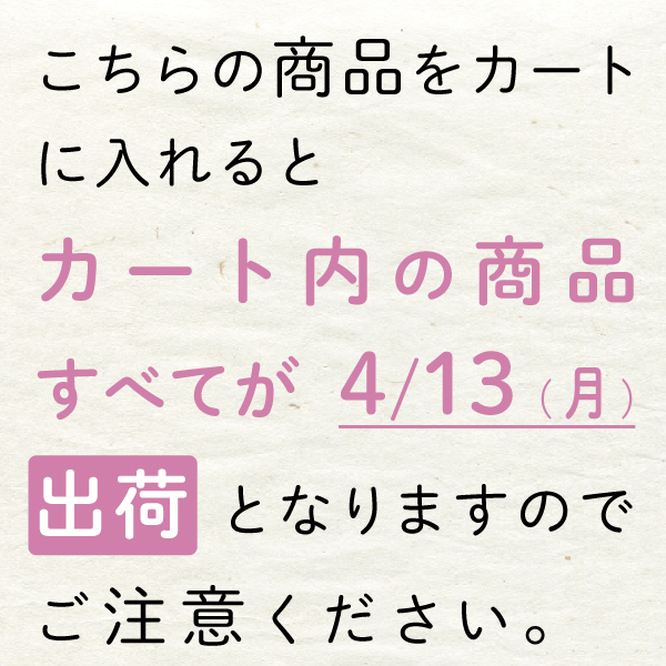 こちらの商品がカートに入ると、カート内すべての商品が4/13日以降の発送となります。また、発送はクール便となります。クール料金は+330円~+720円、 北海道,沖縄は料金が異なります。(140サイズは佐川急便利用) ご注文確定後、あらためてクール代を加算した料金をお知らせ致します。