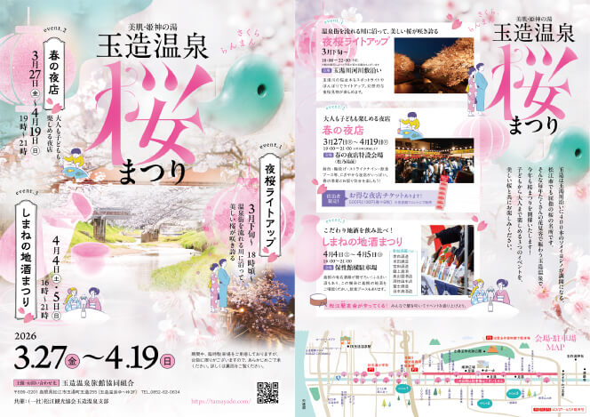 玉湯川沿いの桜を眺めながら「夜桜ライトアップ」「春の夜店」「しまねの地酒まつり」をお楽しみください。ふるまい酒もあり、飲食ブースもあります。